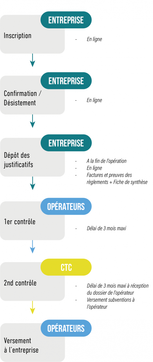 Après contrôle, CTC débloque les fonds dans un délai maximum de trois mois. Les fonds sont ensuite versés à l'opérateur qui les verse alors à chacune des entreprises bénéficiaires. Ce qui porte à six mois le délai maximum pour percevoir sa subvention après la réalisation d'une opération.