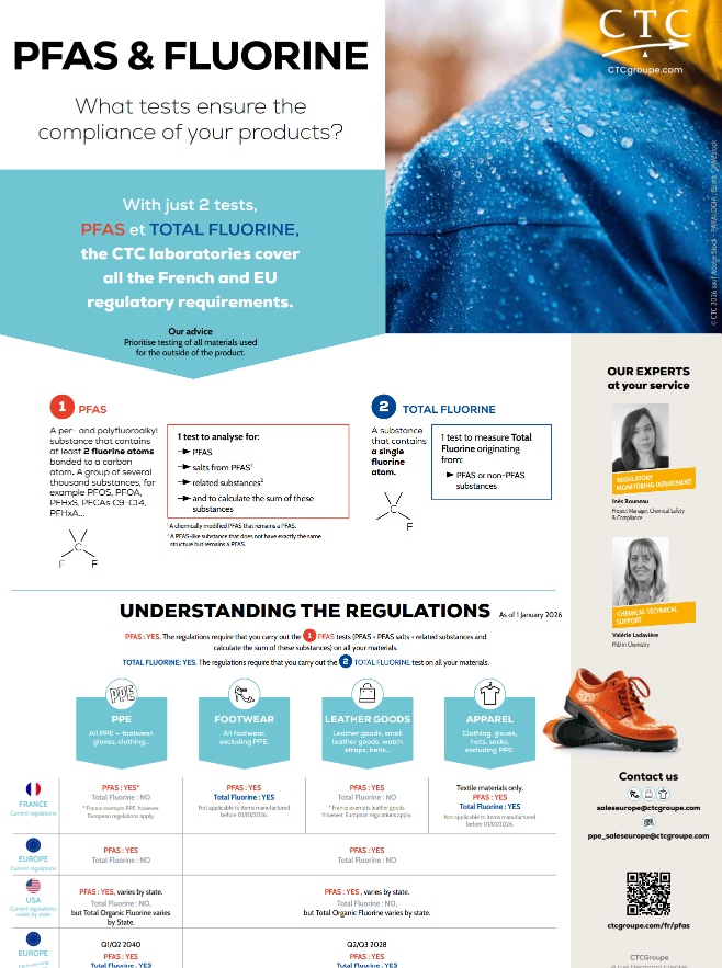 PFAS may be present in many products, including: leather and leather goods (surface treatments), footwear, personal protective equipment (PPE), textiles and technical components. The level of risk depends on the materials, the treatments applied and the end use.