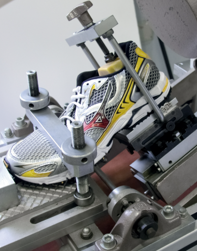 L’essai consiste à fléchir longitudinalement la chaussure au niveau de l’avant pied sous un angle de 25° puis à mesurer le couple qu’il faut exercer pour tordre la chaussure à 30° vers l’intérieur et à 30° vers l’extérieur.